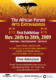 for artists of African origin or with an affiliation to Africa to showcase and sell their works in Painting, Photography and TextileDesign. The exhibition will take place from November 26th to 28th 2009, at the Red Shed in High Wycombe’s Bucks New University. Access will be free and unlimited daily from 10am to 7pm. An official launch will be marked with a Vernissage on November 26th from 6pm to 9pm, with refreshments, snacks and music.